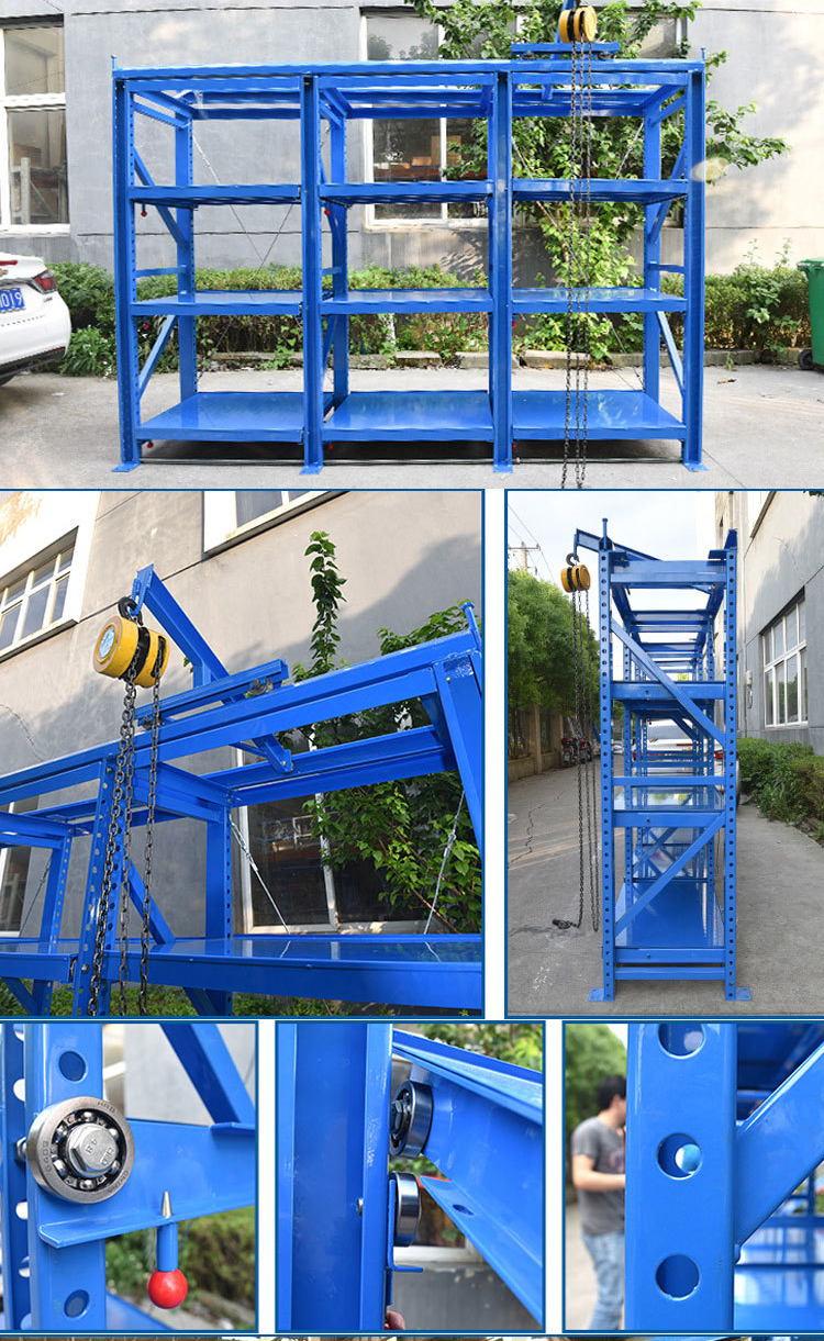 模具货架又称模具架或抽屉式货架,主要存放各种模具物品,根据层载能力要求分为轻型模具货架和重型模具货架。货架顶部可配置移动葫芦车,以方便模具的起吊。