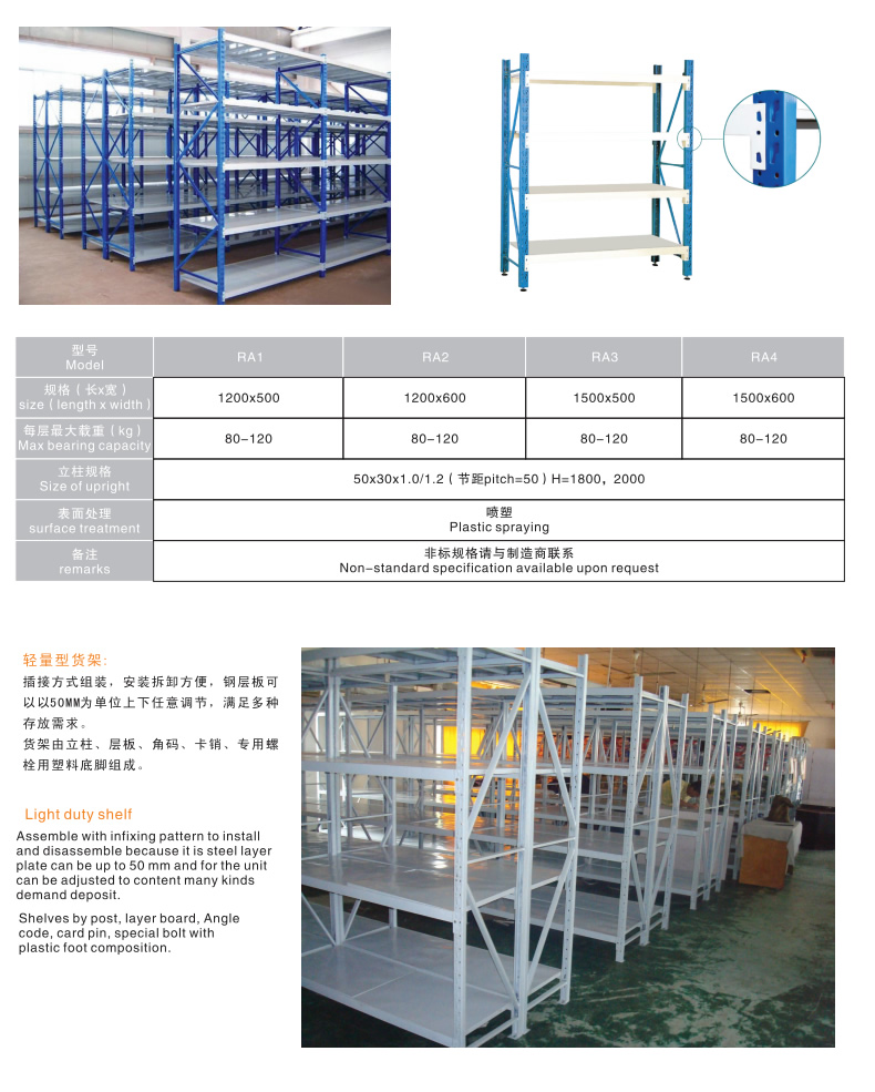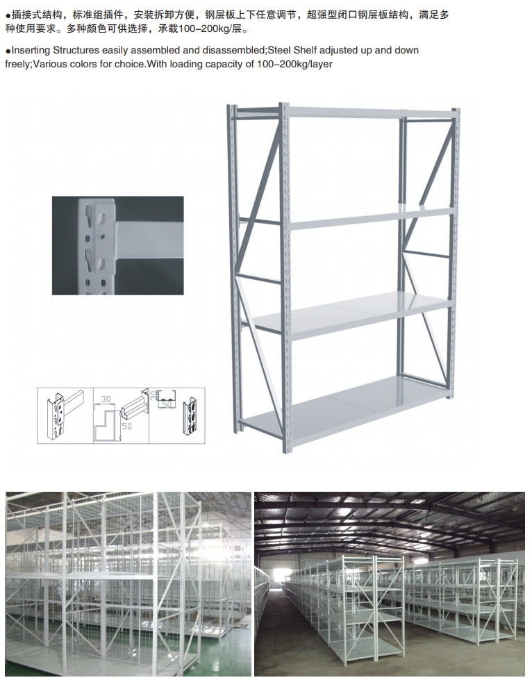 轻型货架是非常经济实用方便的一款仓库货架,因其载重量较轻,故常称为轻型货架。货架是由三种构件:立柱片、横梁、层板组成。轻型货架整体采用无螺钉组合式设计,安装拆卸方便快捷。适合存放一些轻质小件货品,是层板货架的一种。轻型货架的结构与中型相同,可自同拆装,层高以5cm间距可自由调节,只是其材料规格相对较小,承载量也相对较小,此种轻型货架价格相对经济,结构相对万能角钢货架要稳定牢靠,在1500cm跨度内,可承载100-200kg.表面采用喷塑处理,美观整洁。 适用于存放轻中型物品,人工存取的场合。