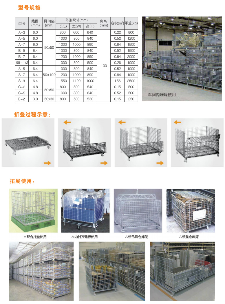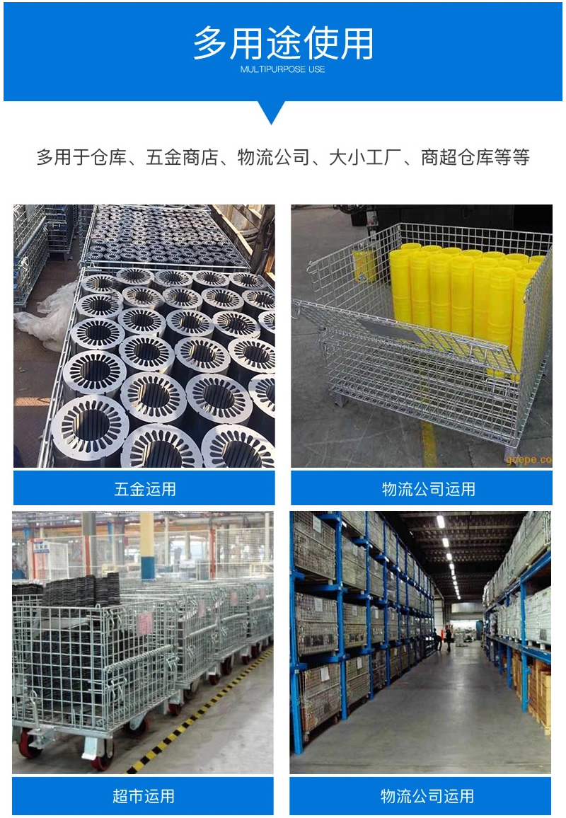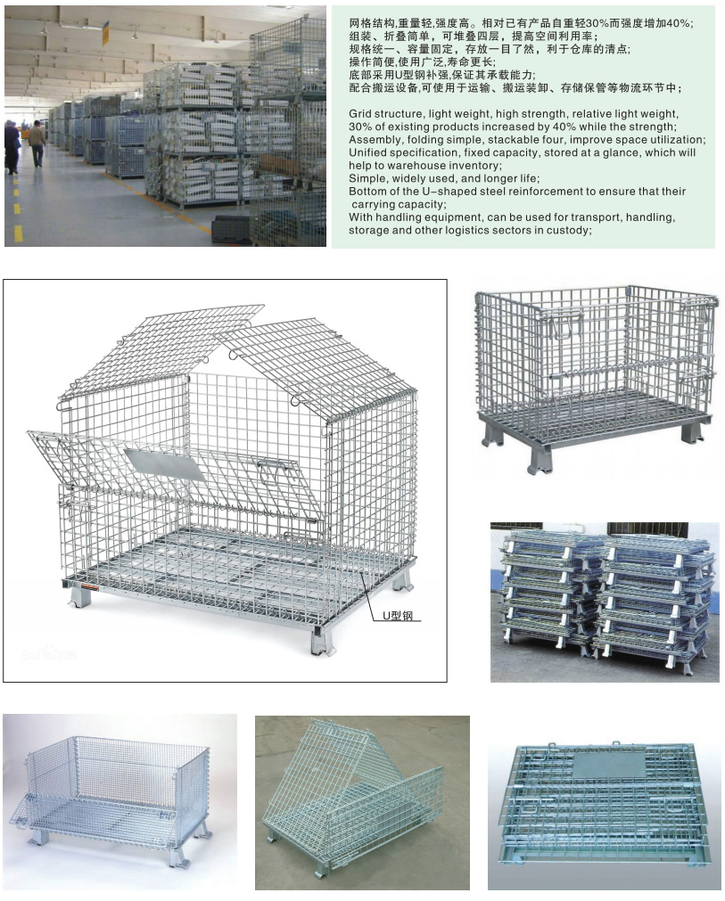 仓储笼,具有存放物品容量固定、堆放整洁、存放一目了然、便于库存清点等优点,同时也提高了仓储空间的有效利用率。此外,该产品坚固耐用、运输便捷、能重复使用,能有效降低仓储企业的人力消耗及包装成本。此产品不仅可以用于工厂生产车间,而且可以用于超市作为展示促销和仓储,且可以在户外使用。经过改进的仓储笼可放于货架、流水线,也可堆垛:带轮子的仓储笼可在车间方便快捷周转,带有PVC板或铁板的仓储笼可防止小件漏掉。