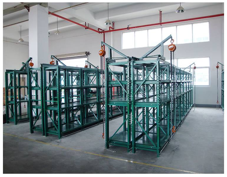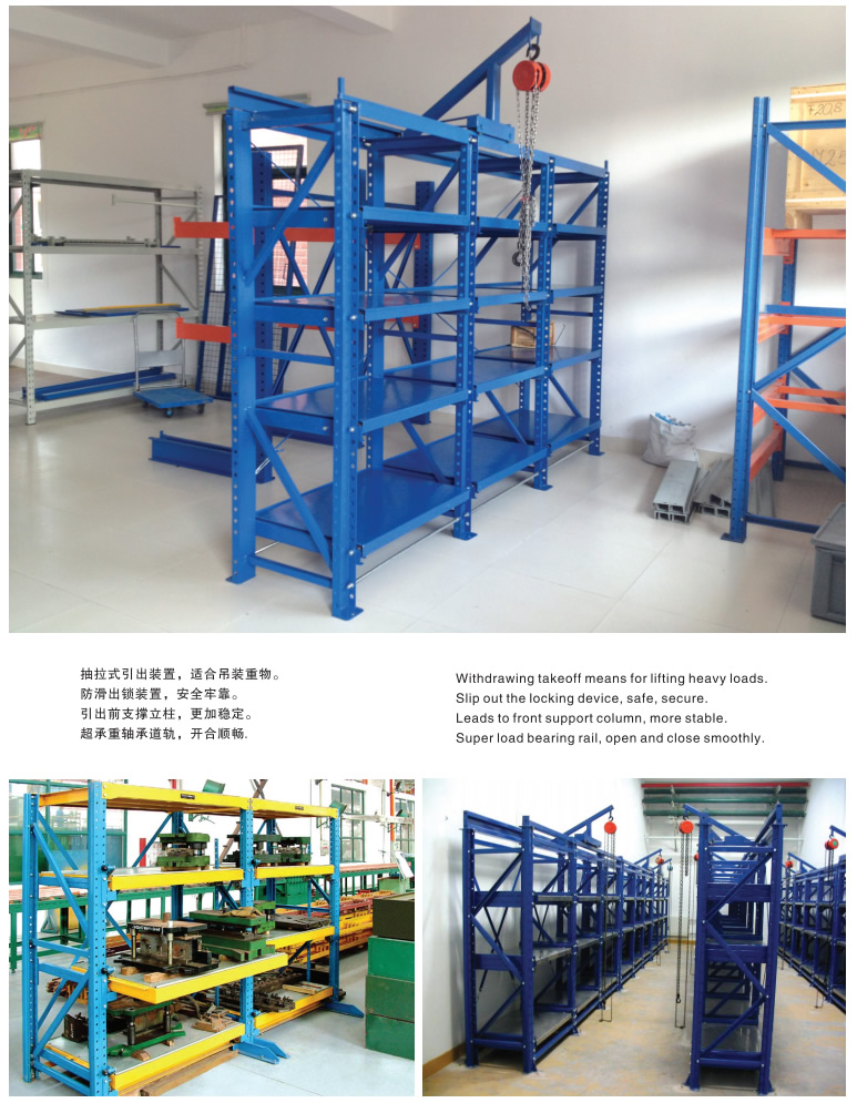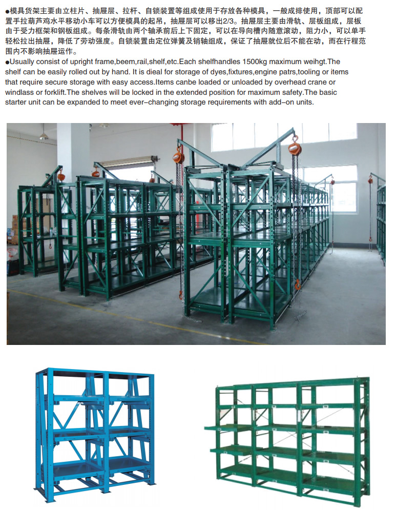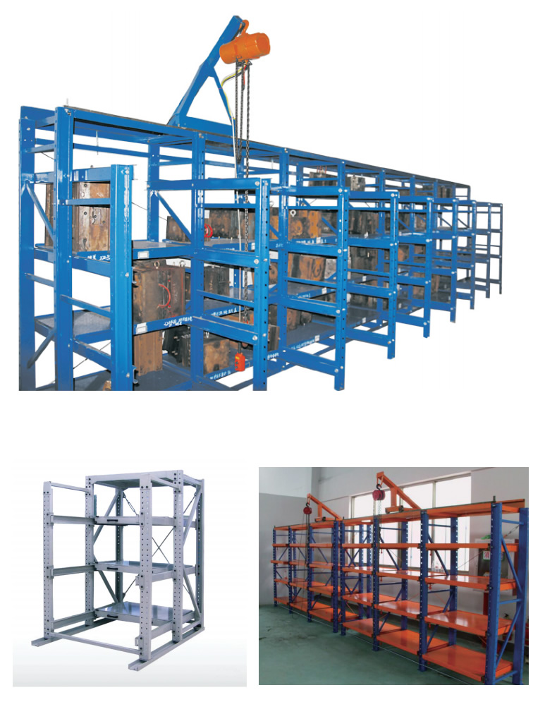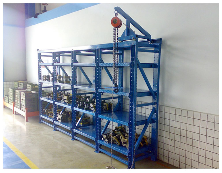 模具货架又称模具架或抽屉式货架,主要存放各种模具物品,根据层载能力要求分为轻型模具货架和重型模具货架。货架顶部可配置移动葫芦车,以方便模具的起吊。