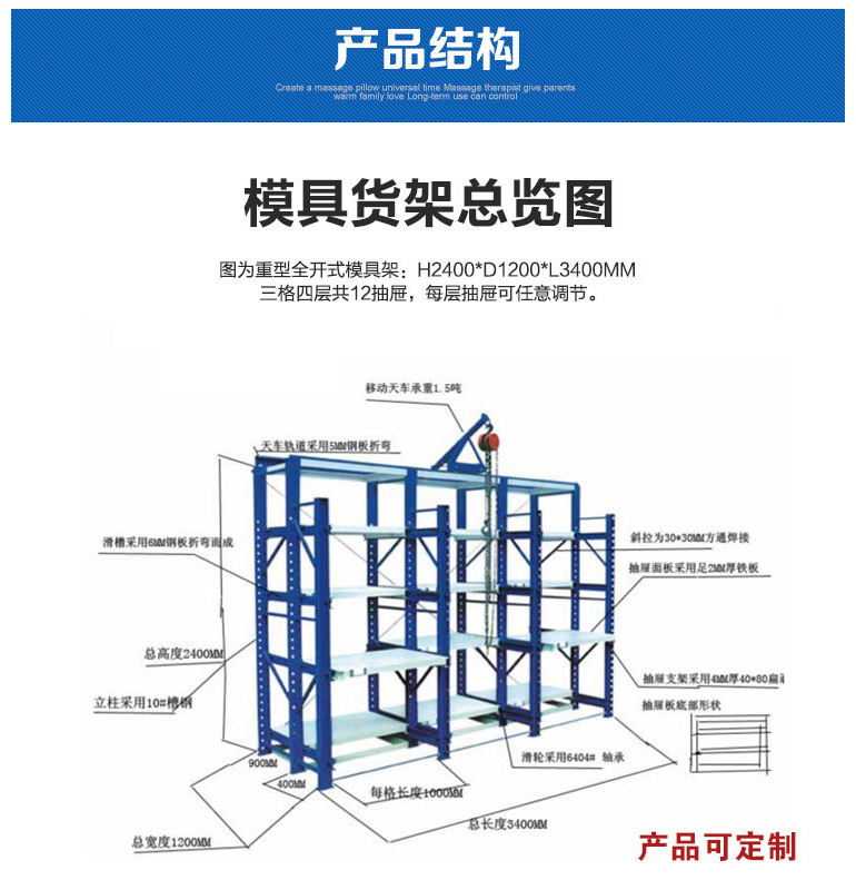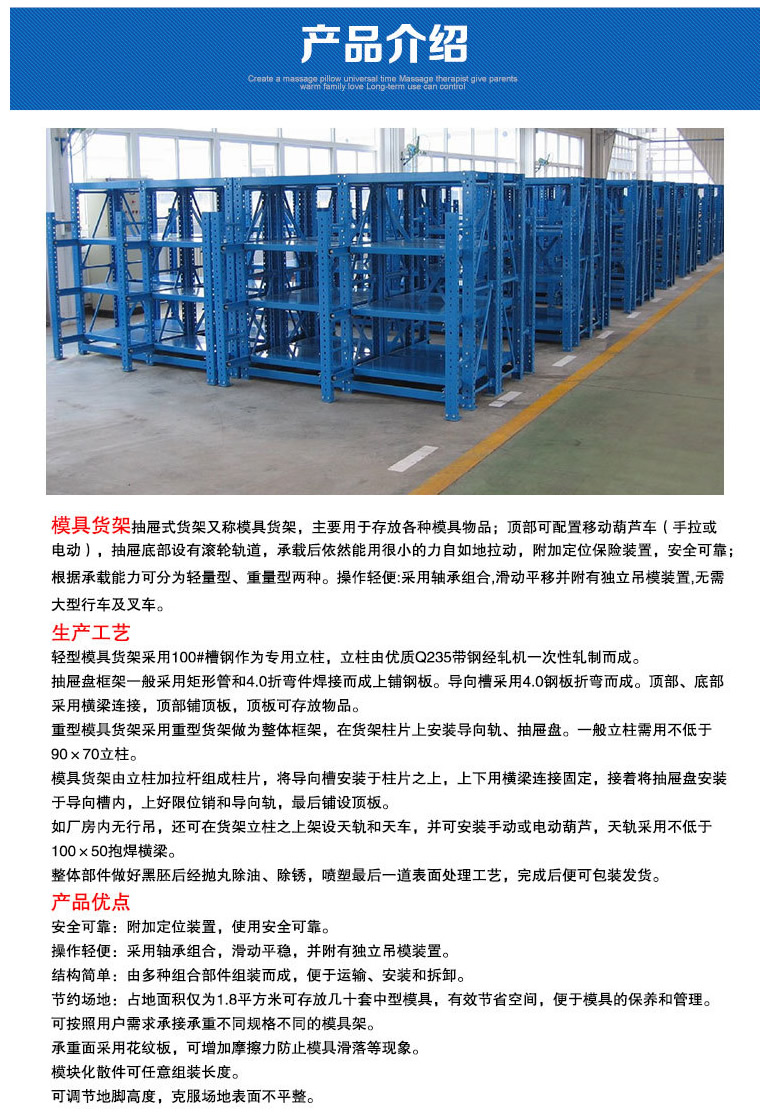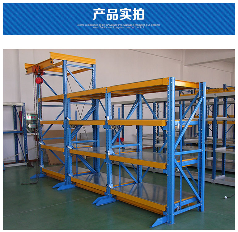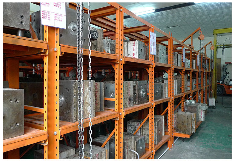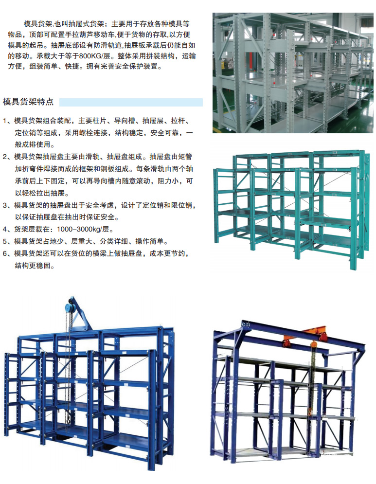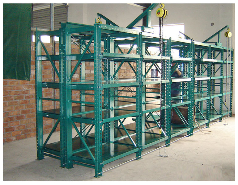 模具货架又称模具架或抽屉式货架,主要存放各种模具物品,根据层载能力要求分为轻型模具货架和重型模具货架。货架顶部可配置移动葫芦车,以方便模具的起吊。