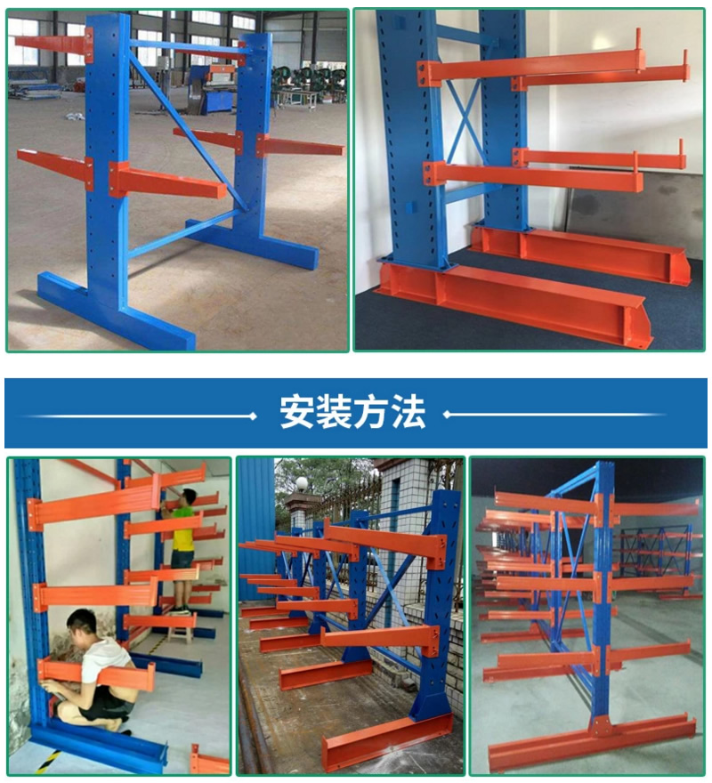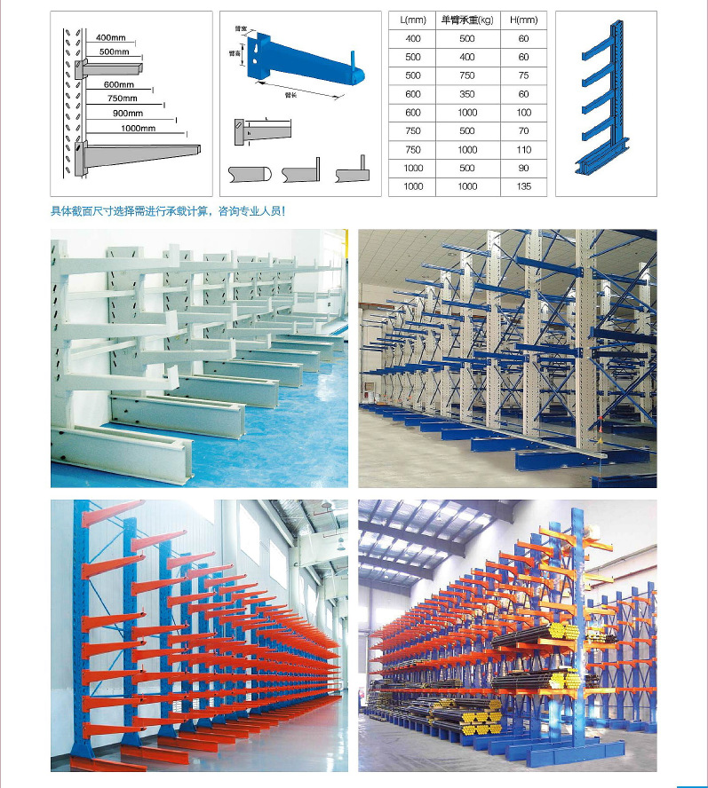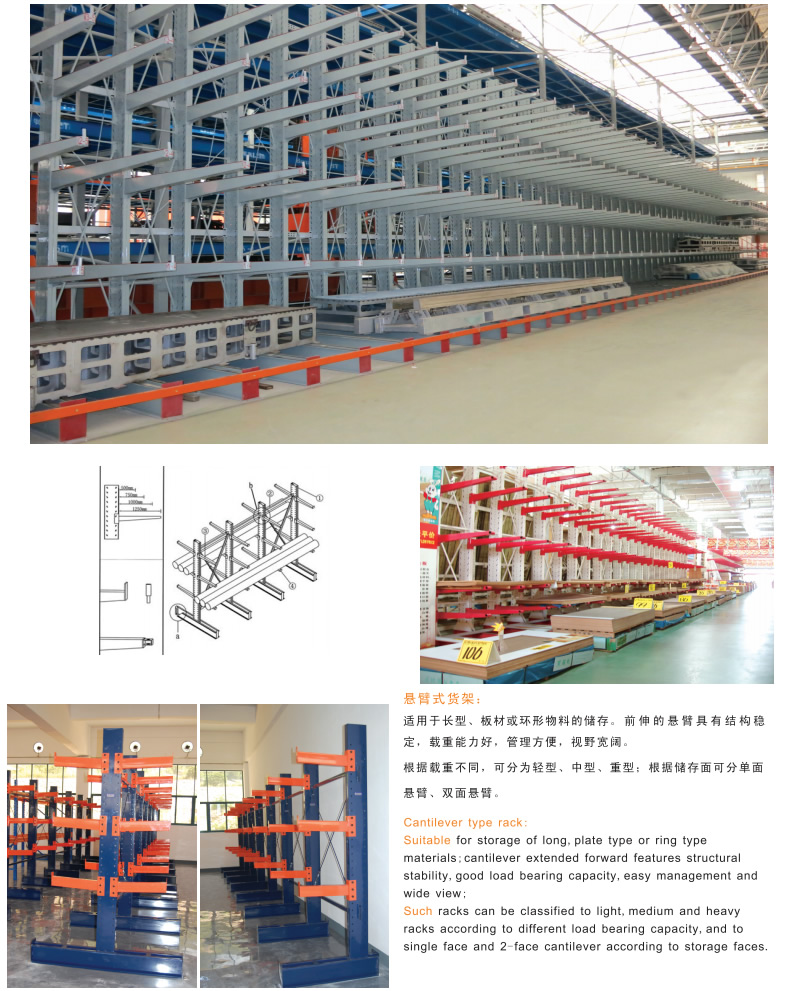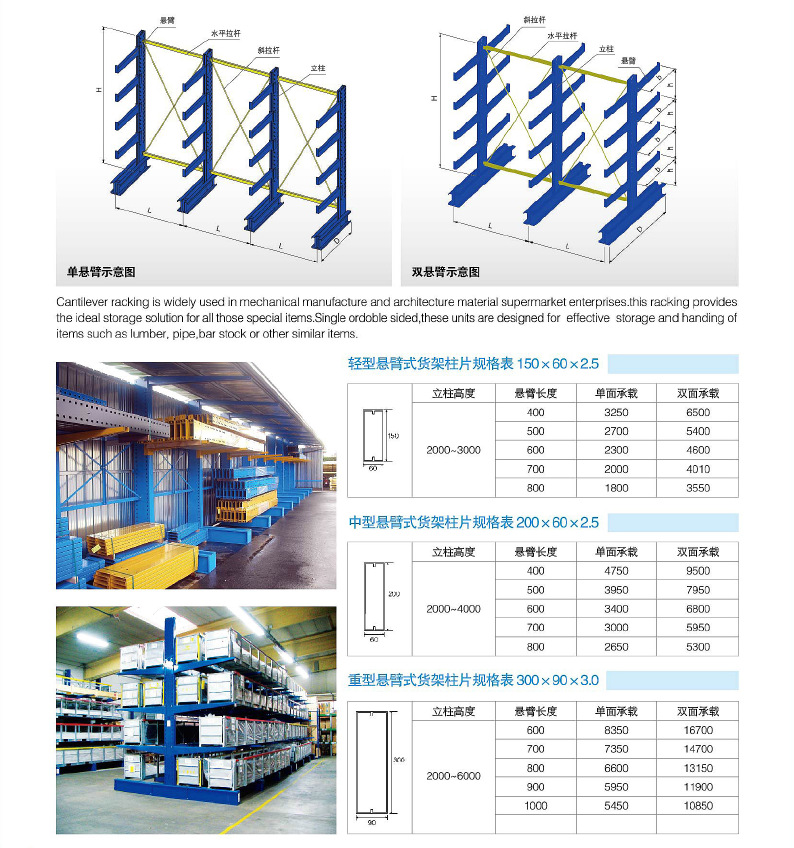 悬臂是属于仓储货架类别中的一类,采用专用型材立柱,配高强度悬臂,适用于存放各种长形物料、环型物料、板材和不规则物料等。其前伸的悬臂可以是单面或双面,具有结构轻、载重能力好的特点,单臂承重可达1000kg.特别加固的立柱结构,可以承受2000~3000kg压力。设计背拉增加货架整体稳定性,安装简易,配件齐全。组合式结构,专用型材立柱,设计背拉增加稳定性,配高强度悬臂(臂可以为单面或双面),具结构轻巧、载重能力好、空间利用率高;加了搁板后,特别适合空间小,高度低的库房,管理方便,视野宽阔,与普通搁板式货架相比,利用率更高;根据承载能力可分为轻量型、中量型、重量型三种。