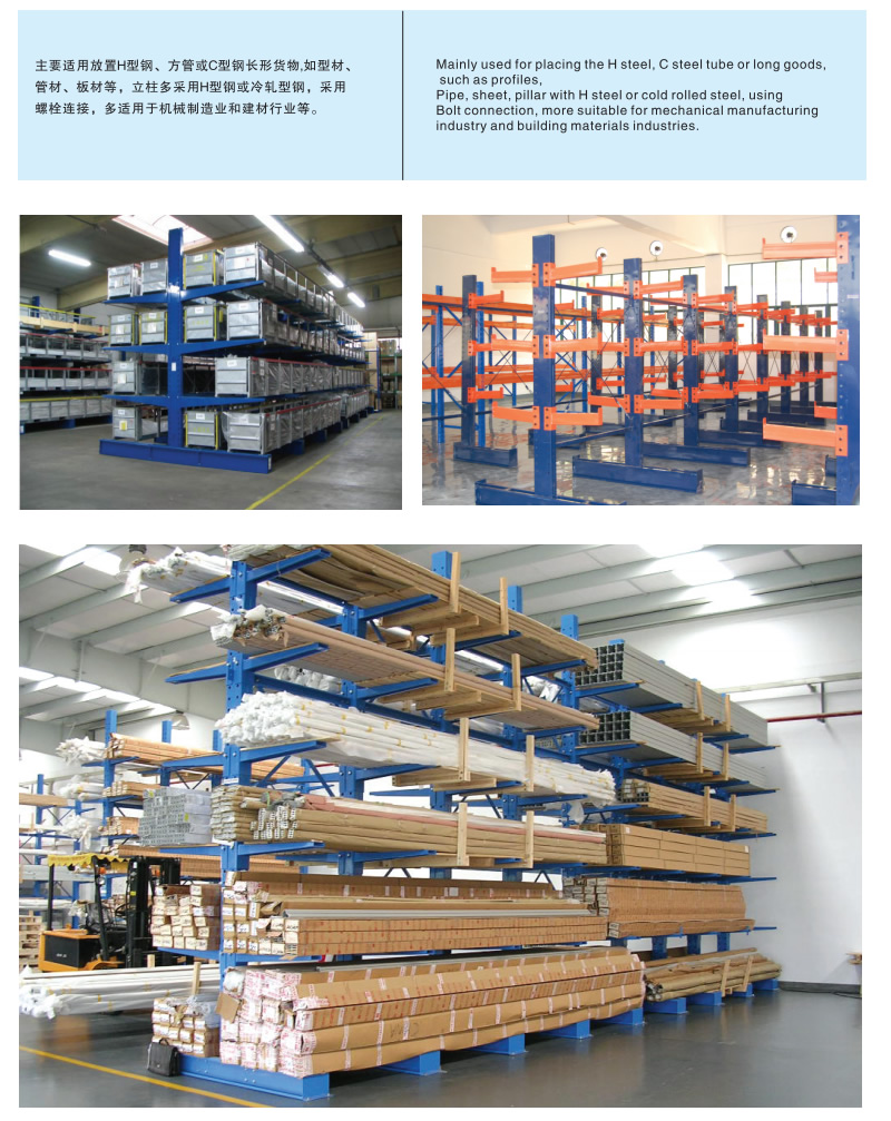 悬臂式货架主要是由立柱片、悬臂梁、连接杆等组成的货架,其特点是前伸的悬臂结构轻巧,载重力强,对存放不规格或是长杆件物料,能大幅度提高仓库的利用率和工作效率,悬臂可是单面或双面。
